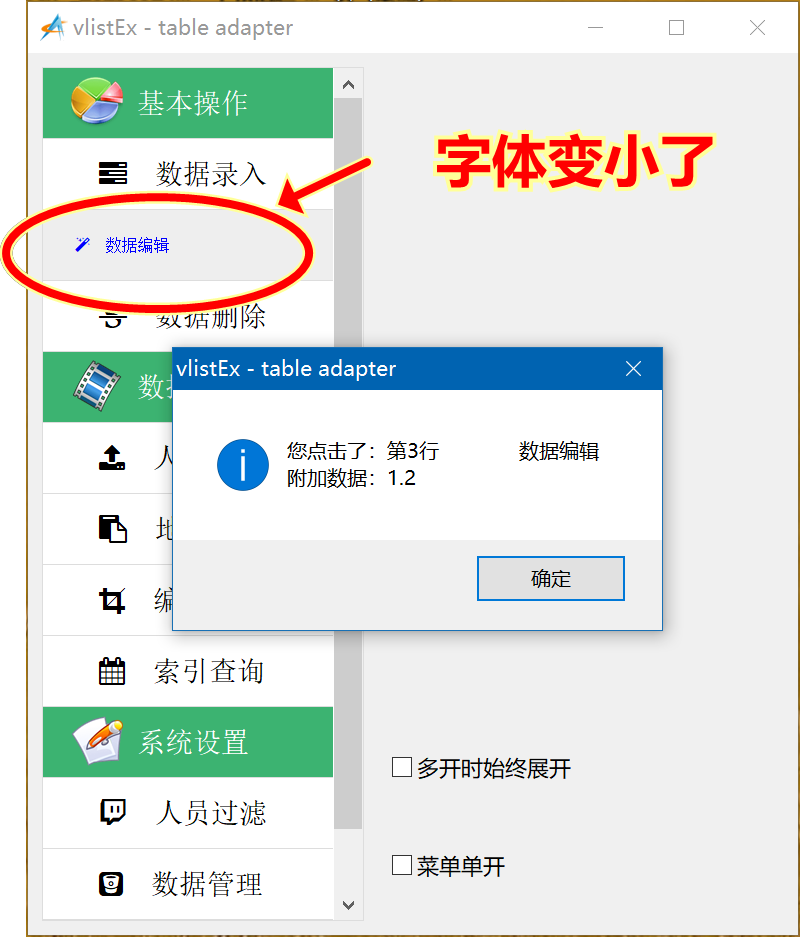在学习光神的godking.vlistEx.listbar示例时(文件名:listbar库例程.aardio ),发现如果点击了一个项目item后,如果鼠标移出该项目,它的字体会变小(而点击菜单不存在这个问题)。
