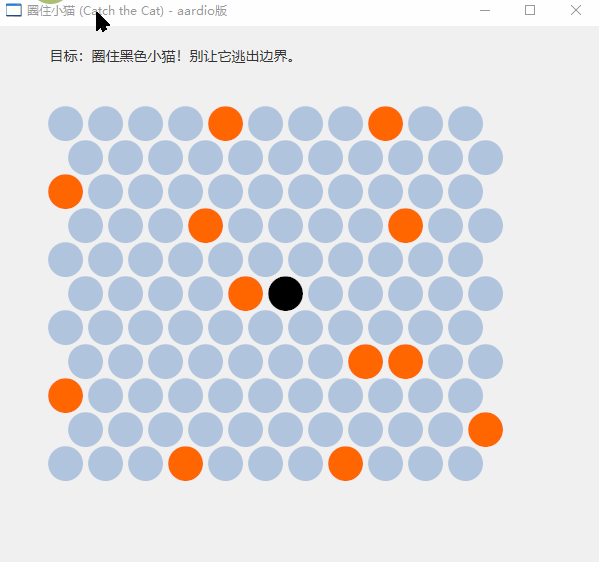 你可以直接运行这段代码,在界面上点击圆点来围堵那只“黑色小猫”!